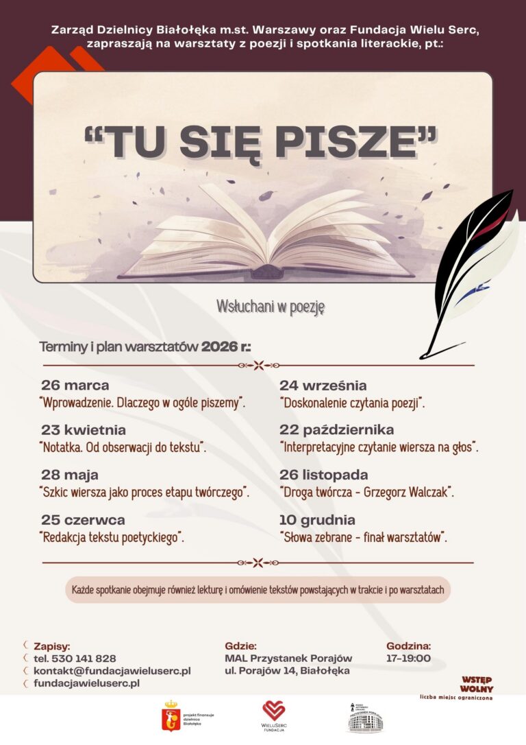 Szukasz miejsca, gdzie możesz rozwijać swoją wrażliwość językową i nauczyć się pisać wiersze?Warsztaty poetyckie „TU SIĘ PISZE” na Białołęce to cykl spotkań dla osób, które chcą tworzyć, rozumieć i interpretować poezję – niezależnie od poziomu zaawansowania. To nie tylko kurs…